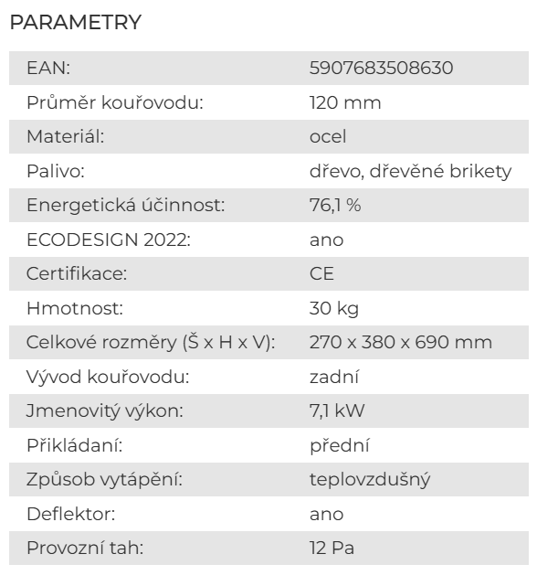 Jedná se o jednoduchá, ale velice účinná kamna.Dvojí regulace proudění vzduchu ve spodních a horních dvířkách umožňují nastavení spalování dle Vašich potřeb.