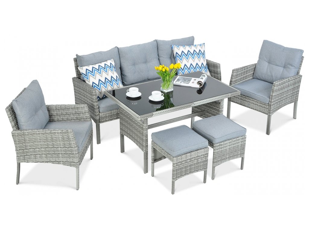 - set obsahuje: sofa pro 3 osoby, 2 křesla , 2x taburet a stůl s tvrzeným sklem 5mm v černé barvě