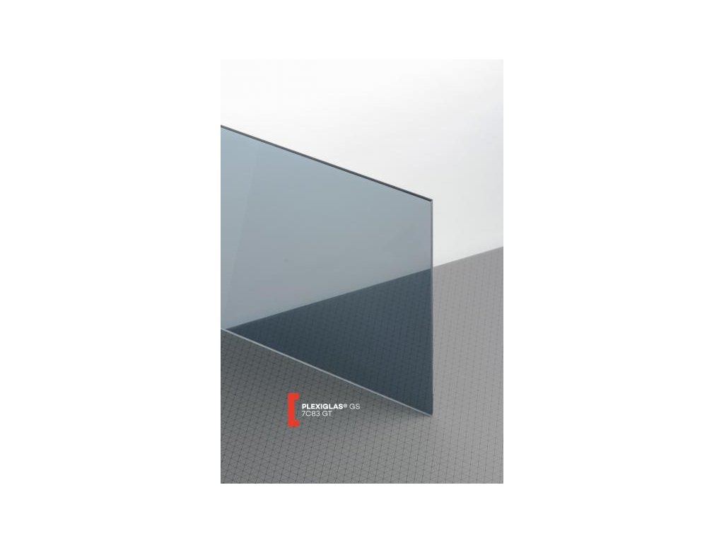 Lité šedé barevné kouřové plexisklo tl. 4mm Plexiglas GS 7C83 s propustností světla cca 21%. Jedná se o velmi kvalitní druh plexiskla, materiál je vysoce odolný proti UV záření a povětrnostním vlivům. Obě povrchové strany těchto desek z plexiskla jsou hladké a vysoce lesklé, dodávané s ochrannou folií. Široké použití v reklamě, stavebnictví a průmyslu. Výroba litím znamená, že materiál se naleje mezi dvě skleněné desky a v peci postupně chládne. Tímto získává menší vnitřní pnutí, avšak větší tloušťkovou toleranci než extrudované plexisklo.