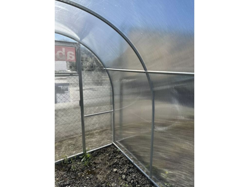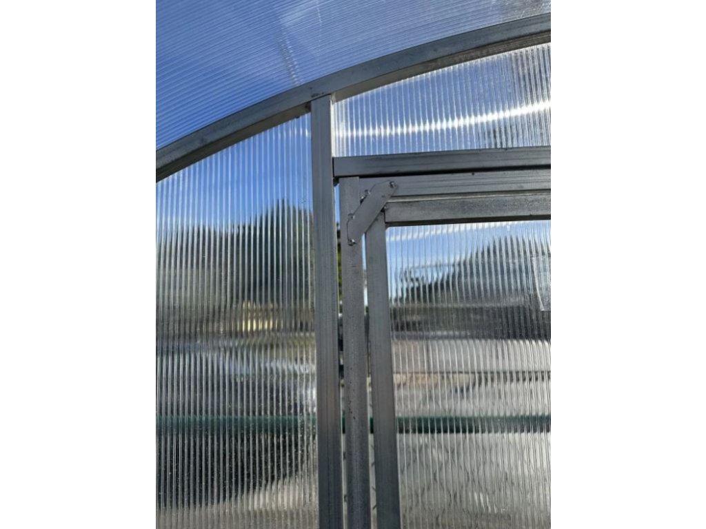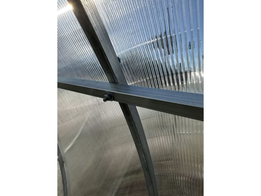 Přední a zadní čela skleníku jsou z výroby svařené a tvoří jednolitý celek. Obsahem dodávky je kompletní skleník = nosná konstrukce (včetně dveří a oken), veškeré potřebné spojovací prvky + polykarbonátové desky a montážní návod.