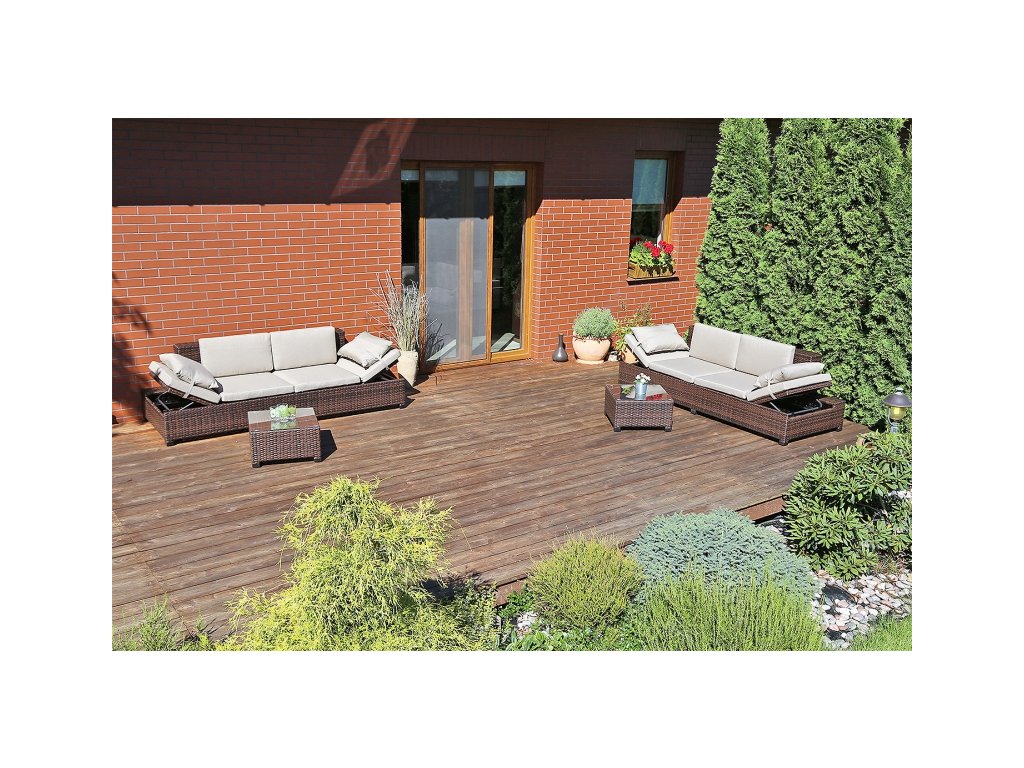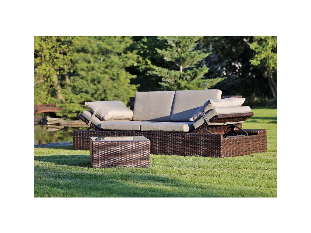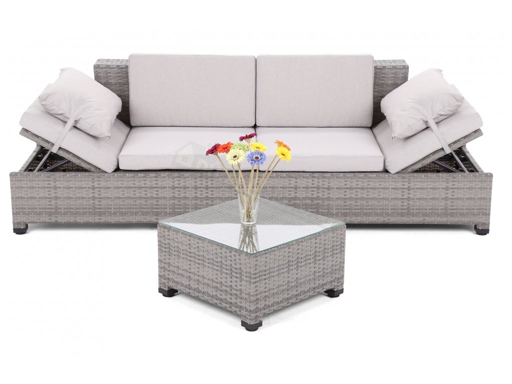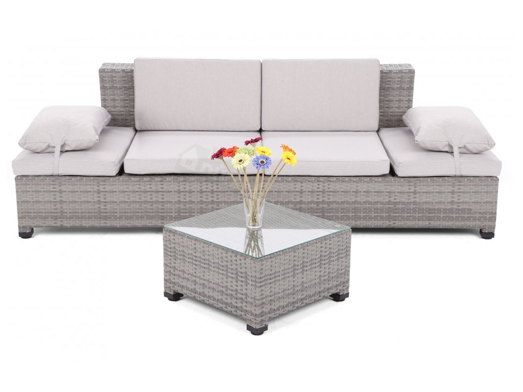 Milano 2 v 1 zahradní sofa - lehátko a velká pohodlná pohovka v jednom. Konstrukce pohovky byla vyrobena z hliníkových profilů s práškovým povrchem a komplet je opletený silným technoratanem ve světle šedém provedení. Pohovka má nastavitelné opěrky hlavy v pěti polohách, což vám umožňuje ideálně přizpůsobit k co nejpohodlnějšímu použití. Přiložené polštáře v šedé barvě jsou vyrobeny z kvalitního a silného materiálu. Díky zipům, je možné potah sundat a snadno vyčistit. Sada obsahuje také malý konferenční stolek s tvrzeným sklem. Nohy pohovky a stolu jsou nastavitelné, což umožňuje vyrovnání sestavy na nerovném povrchu. Sofa Milano se hodí jak do zahrady, tak na terasu, stejně jako do interiéru.