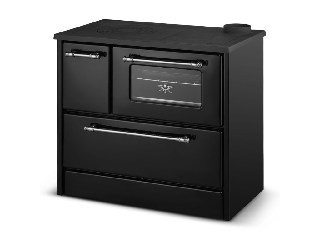Sporák na tuhá paliva s troubou na pečení a litinovou plotnou - černý / levý