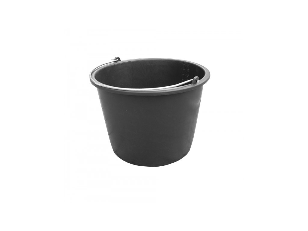 Vědro z černého plastu s měrkou - ideální pro práci na zahradě nebo při stavebních pracích.