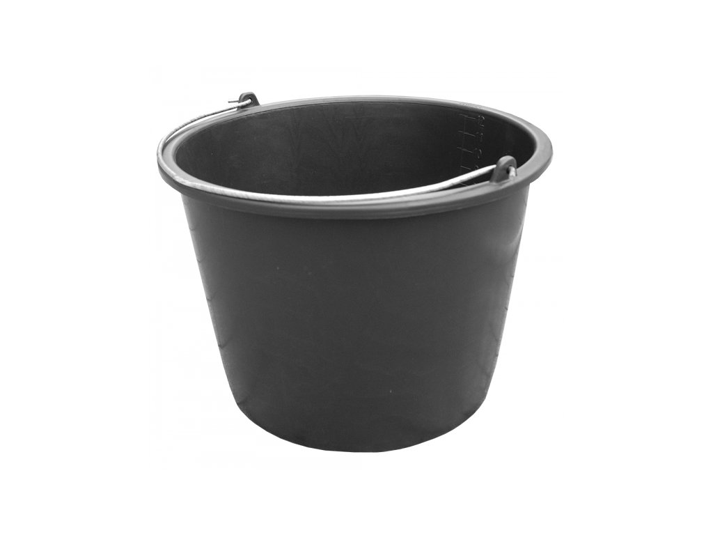 Vědro z černého plastu s měrkou - ideální pro práci na zahradě nebo při stavebních pracích.