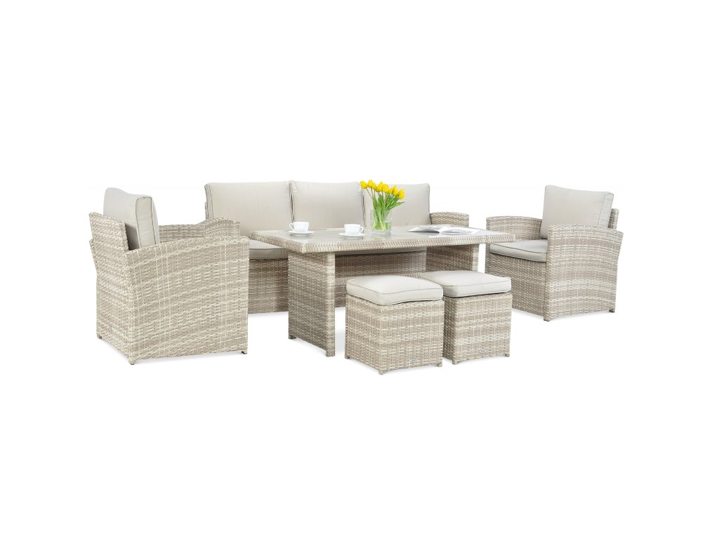 Sada polyratanového nábytku navržená pro maximální pohodlí až pro 7 osob. Sada Borneo + taburety zahrnuje třímístnou pohovku, 2 křesla, 2 taburety a velký praktický stůl se skleněnou deskou.