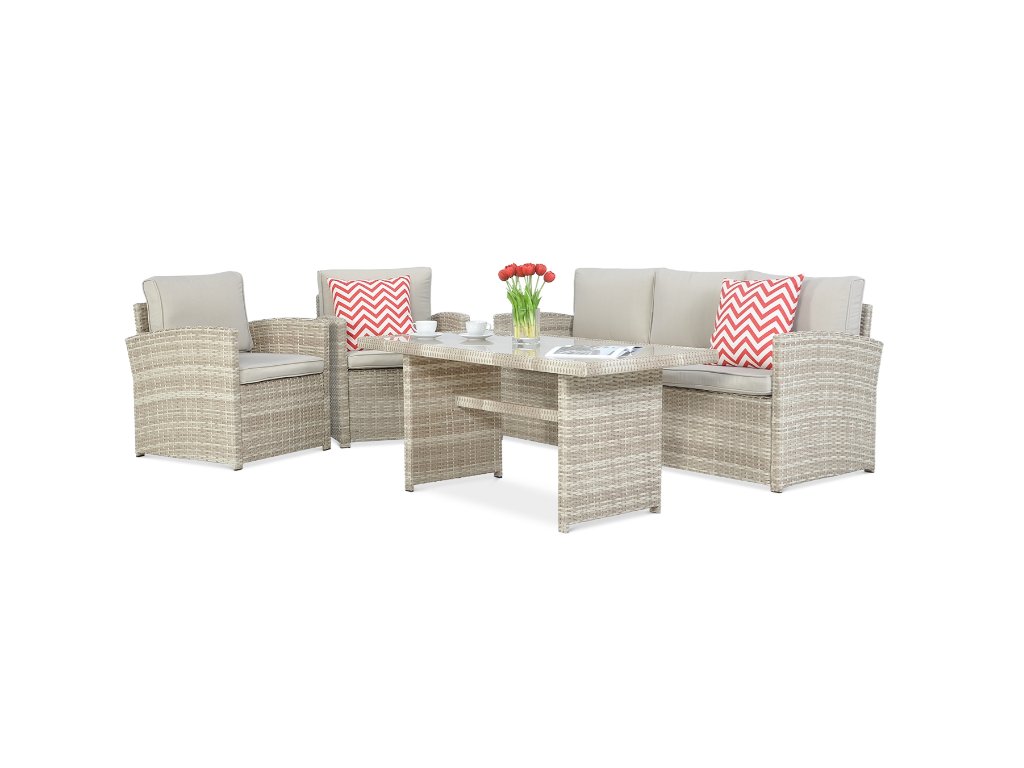 Nábytek se vyznačuje svým pohledným designem a všestranností vyplývající z jeho materiálových vlastností. Konstrukce sady Borneo je vyrobena z odolné a pevné oceli pokryté béžovým technoratanem. Tento zahradní nábytek vám bude sloužit po dlouhou dobu, při různých příležitostech, bez nutnosti jakékoli údržby. Navíc je vhodný nejen pro používání venku, ale i v interiéru. Umělý ratan zůstává odolný vůči všem rozmarům počasí a zachovává si stejný vzhled narozdíl od jeho přírodního protejšku.