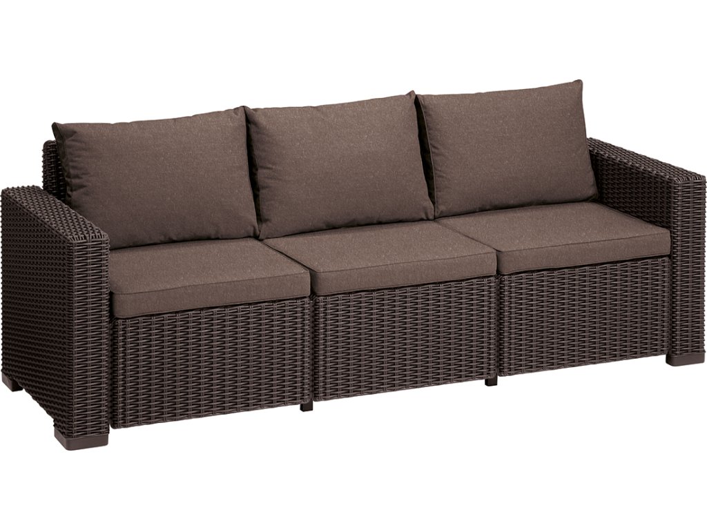Třímístná zahradní sofa KETER California v hnědém provedení s pohodlnými poduškami v ladící barvě teplého odstínu taupe poskytne nevšední posezení na jakékoliv zahradě či terase. Její atraktivní design, který imituje vzhled přírodního ratanu, se skvěle hodí do jakéhokoliv prostředí.