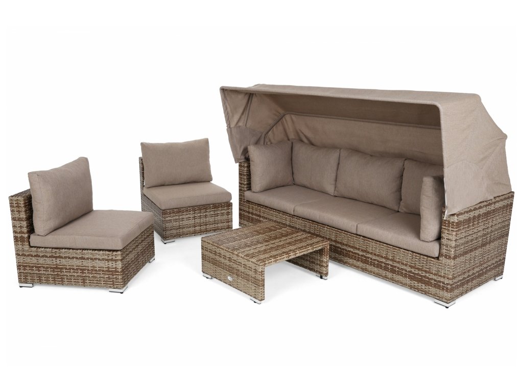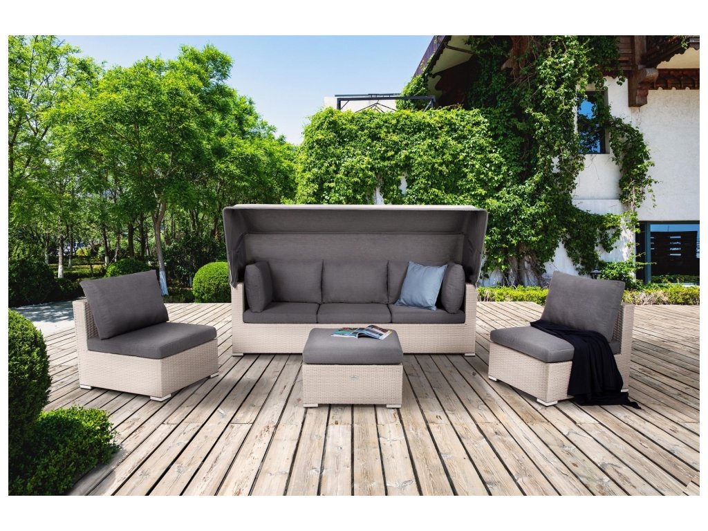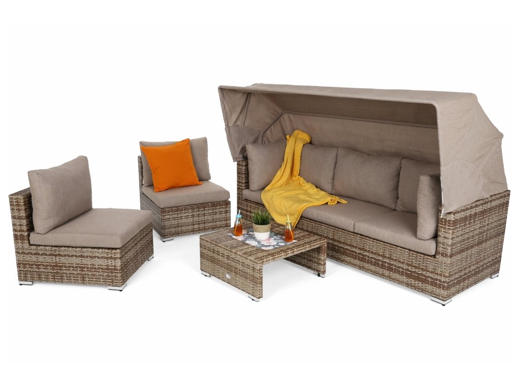 - sada obsahuje: sofa se sklopnou stínící střechou, 2 moduly pro sezení a kávový stolek