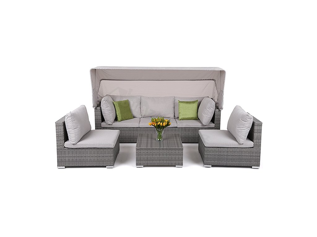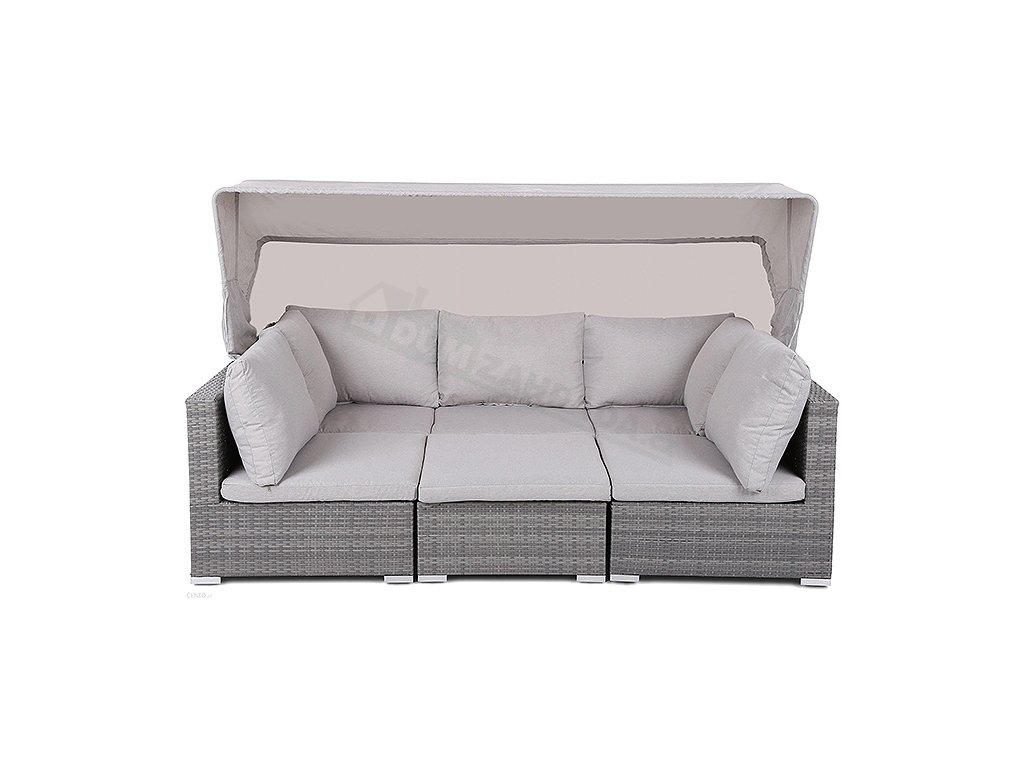 Vigo je originální zahradní nábytek v šedých odstínech složený z několika segmentů: prostorná pohovka se sklopnou stínící stříškou, 2 pohodlná křesla a stůl, který lze použít i k sezení. Jedná se tedy o moderní a praktickou sadu, která nabízí prostor až pro 6 osob. Díky své modulární struktuře může být použit jako rohohová sedačka nebo pohovka s dalšími samostatnými křesly.