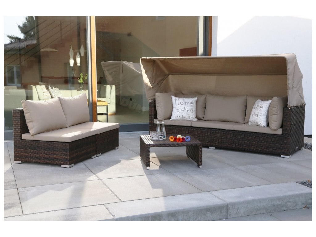 Ocelová, práškově lakovaná konstrukce a ručně pletený technoratan zajišťují odolnost vůči povětrnostním vlivům a zaručují dlouhou životnost setu. Pohovka má skládací stínící stříšku, který vás ochrání před slunečním zářením a vytvoří tak příjemmné stinné místo. Pohovka i další prvky jsou vybaveny pohodlnými polštáři, které umocní relaxaci.