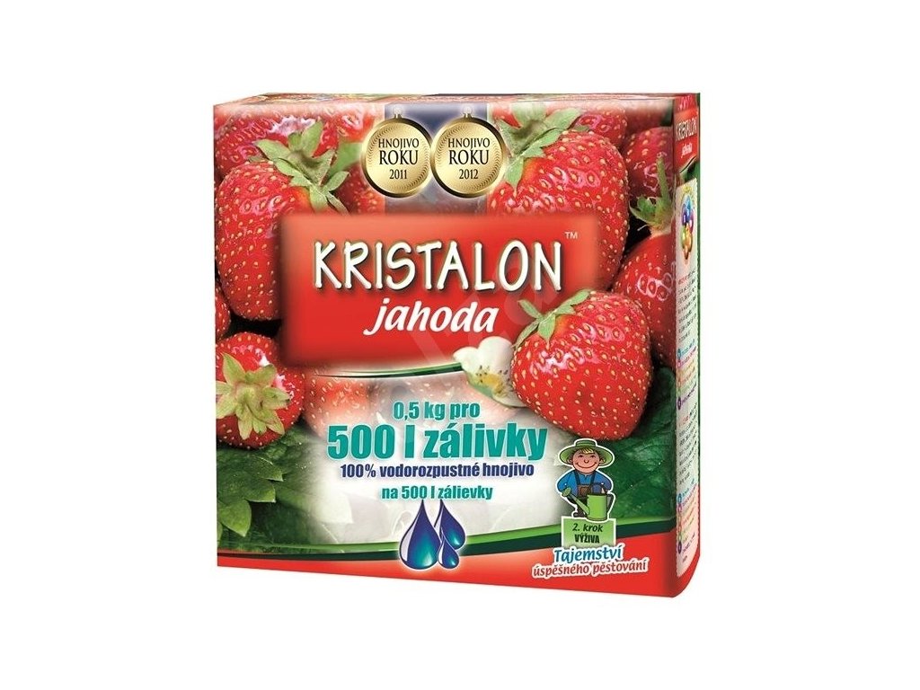 Hnojivo Kristalon určené pro přihnojování jahodníkových kultur zajistí rychlejší počáteční růst díky přímé absorpci fosforu a rychlejší nástup produkčního období. Je vhodné pro všechny druhy jahod pěstovaných ve volné půdě i v nádobách. Aplikace zálivkou i postřikem se doporučuje 1x týdně.