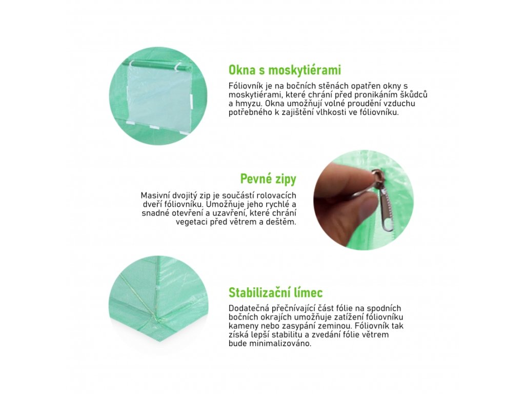 Zahradní fóliovník VespaGarden zelený 2x3m (6m2) je vyroben z vysoce kvalitních materiálů. Silná ocelová pozinkovaná konstrukce o průměru profilů 25mm a síle 0,7mm je doplněna plachtou z polyethylénu s UV filtrem UV-4. Zapuštěná polypropylenová síťka zvyšuje pevnost plachty a zabraňuje jejímu trhání. Boční stěny fóliovníku mají okna opatřená moskytiérou, která chrání před pronikáním škůdců a hmyzu. Okna zároveň slouží k ventilaci a lepší regulaci klimatu uvnitř fóliovníku. Vstup je dostatečně široký a snadno uzavíratelný pomocí zipů. Výška fóliovníku umožňuje komfortní provádění prací spojených s péčí o rostliny.