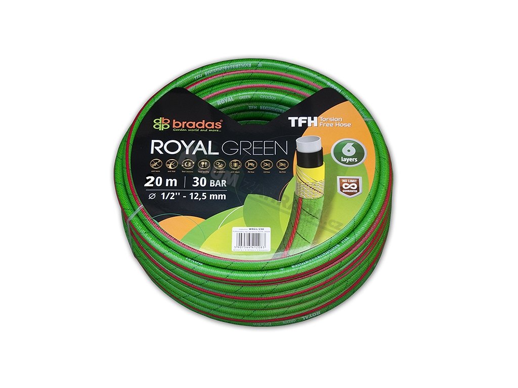 ROYAL GREEN - 6-vrstva flexibilní zahradní hadice se zvýšenou odolností vůči tlaku vody. Vyrobená z velmi pevného polyesteru zpevněná systémem TFH, který minimalizuje ohýbání a kroucení hadice. Kvalitní plast bez použití toxických látek. Dlouhodobá záruka kvality za běžných provozních podmínek.