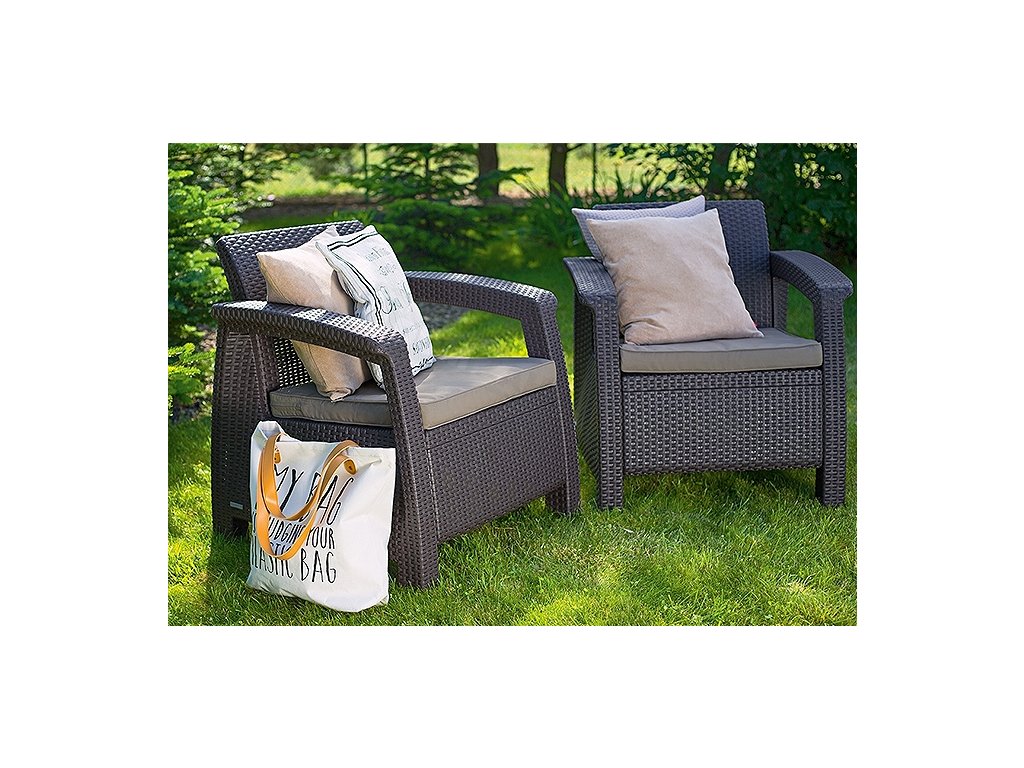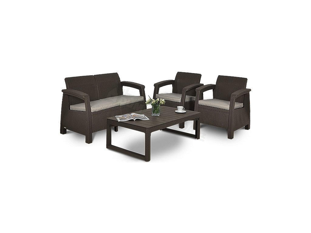 Zahradní komplet Corfu Max 2 Brown tvoří 2 pohodlná křesla a 2 místné sofa doplněné měkkými polštáři. Sadu dotváří stolek s možnpstí regulace výšky. Výrobky KETER se vyznačujÍ vysoce kvalitním zpracováním. Set je možné použít jako komplet a nebo odděleně na jednotlivé segmenty dle potřeby a umístění. Celý komplet je z řady výrobků Corfu, díky čemuž je možné ho kombinovat a doplňovati s dalšími segmenty stejné línie Corfu Allibert. Při výrobě jsou použity materiály velice odolné vůči povětrnostním vlivům i UV záření. Tato sestava nábytku Allibert Corfu Max 2 je ideálním doplňkem pro pohodlné trávení volného času.