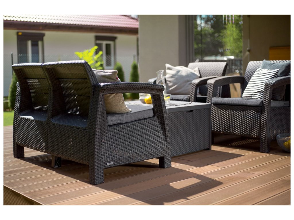 Sada zahradního nábytku Keter Corfu II Box se vzhledem imitujícím přírodní ratan nabídne pohodlné posezení jak na zahradě, tak i v interiéru. Díky kvalitnímu materiálu, ze kterého je nábytek vyroben, vydrží i vlivy UV záření a nepříznivého počasí. Zároveň je lehký a snadno přenosný, ale i pevný a stabilní a nevyžaduje téměř žádnou údržbu. Pohodlné podsedáky a opěrkové polštáře na ergonomicky tvarovaných křeslech s područkami a nosností až 150 kg zajistí maximální komfort. Stolek, s úložným prostorem uvnitř, unese až 50 kg. Nosnost lavice je 2x 110 kg.