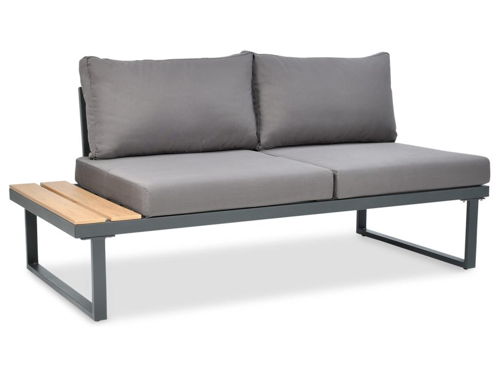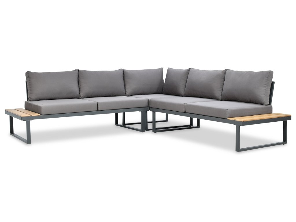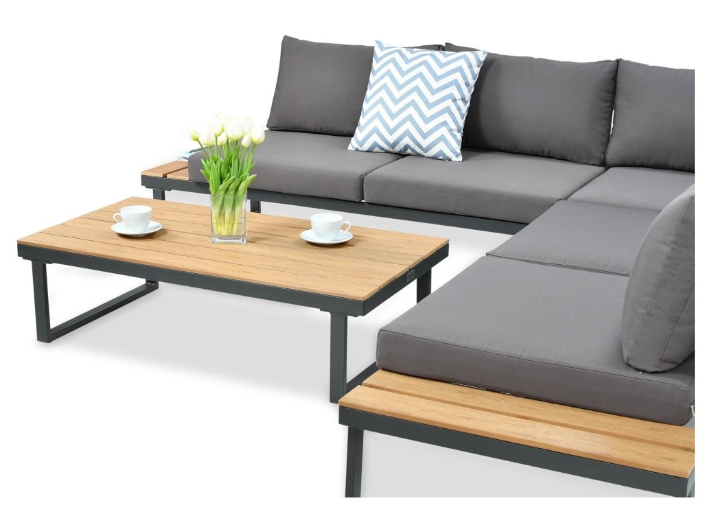 Hledáte pohodlný a zároveň moderní zahradní nábytek? Ocelový rohový set EMERSON Dark Grey je ten pravý! Minimalistická konstrukce je vyrobena z masivní oceli, která zaručuje náležitou pevnost a stabilitu. Sestava se skládá ze 4 prvků: rohová pohovka, dvě 2místné pohovky a konferenční stolek. Na povrchovou úpravu desky stolu a boků sedací soupravy byla použita kompozitní deska "polywood", která je velice estetická. Rohová pohovka má 6 silných a měkkých polštářů a 5 podsedáků, které zajistí maximální pohodlí při oslavách jarních a letních dnů. Použité barvy působí mimořádně uceleně a proto tento set může být součástí i Vašeho moderního obývacího pokoje. Je tedy vhodný pro použití nejen na Vaší zahradě či terase, ale bude se skvěle vyjímat i uvnitř domu. Sada nevyžaduje pracné a složité čištění - k umytí postačí zahradní myčka nebo vlhký hadřík.