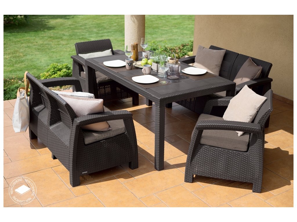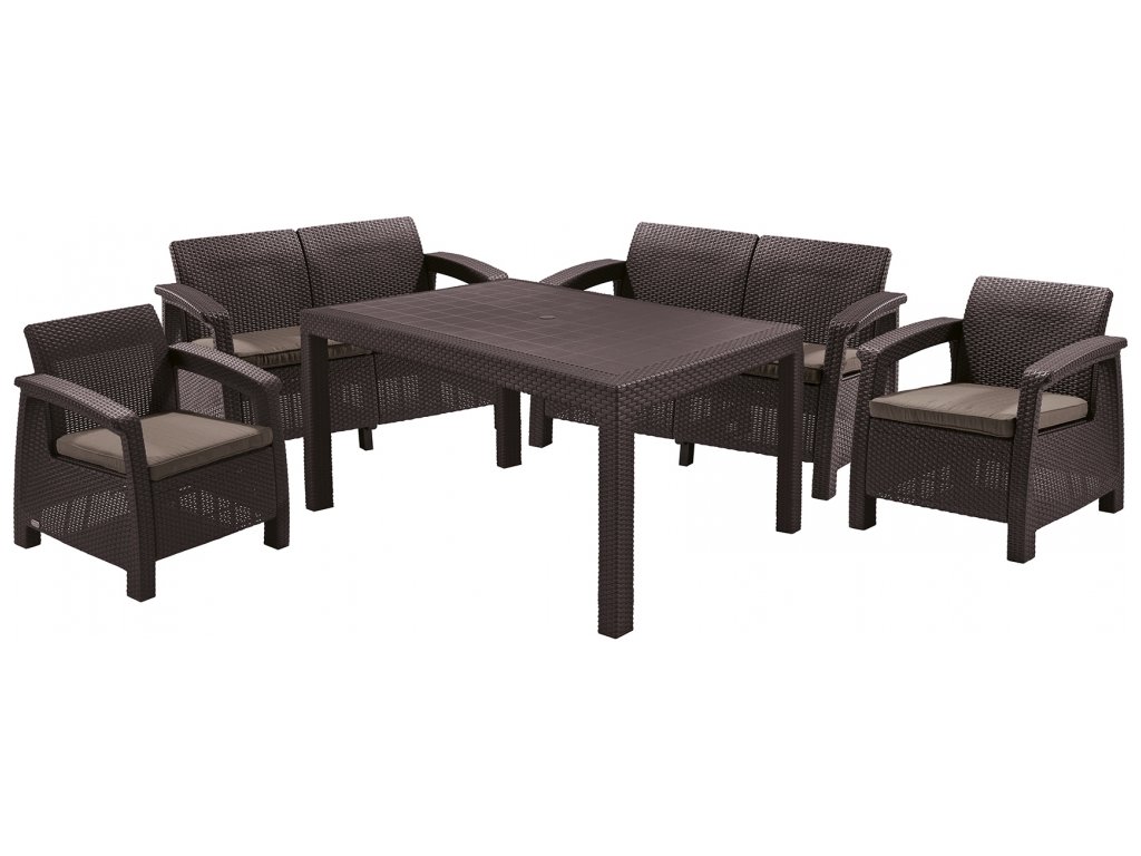 Zahradní set Corfu II Fiesta v hnědé barvě je nábytkový set, který svým vzhledem napodobuje strukturu přírodního ratanu. Set se skládá ze dvou křesel, dvou dvoumístných pohovek (s pohodlnými podsedáky) a velkého obdélníkového stolu. Sada funguje skvěle i jako jídelní nábytek. Corfu II Fiesta je tak ideální set pro uspořádání velkých vnitřních prostor, pro organizaci rodinného grilování nebo i pro zahradní párty s přáteli. Nábytek se vyznačuje dlouhou trvanlivostí a odolností vůči nepříznivým povětrnostním podmínkám a UV záření, takže si po dlouhou dobu udrží svůj původní vzhled i tvar. Díky odolnému plastu, ze kterého je vyroben, nevyžaduje téměř žádnou údržbu a jeho montáž zvládne každý.