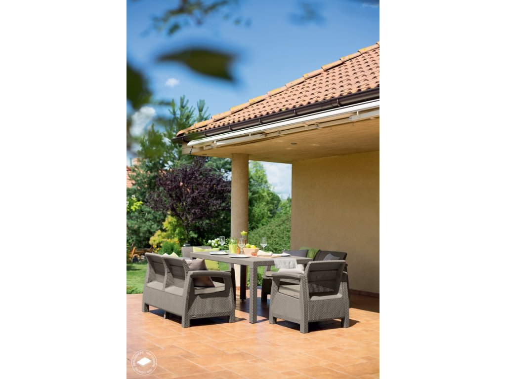 Zahradní set Corfu II Fiesta v krémové barvě cappuccino je nábytkový set, který svým vzhledem napodobuje strukturu přírodního ratanu. Set se skládá ze dvou křesel, dvou dvoumístných pohovek (s pohodlnými podsedáky) a velkého obdélníkového stolu. Sada funguje skvěle i jako jídelní nábytek. Corfu II Fiesta je tak ideální set pro uspořádání velkých vnitřních prostor, pro organizaci rodinného grilování nebo i pro zahradní párty s přáteli. Nábytek se vyznačuje dlouhou trvanlivostí a odolností vůči nepříznivým povětrnostním podmínkám a UV záření, takže si po dlouhou dobu udrží svůj původní vzhled i tvar. Díky odolnému plastu, ze kterého je vyroben, nevyžaduje téměř žádnou údržbu a jeho montáž zvládne každý.