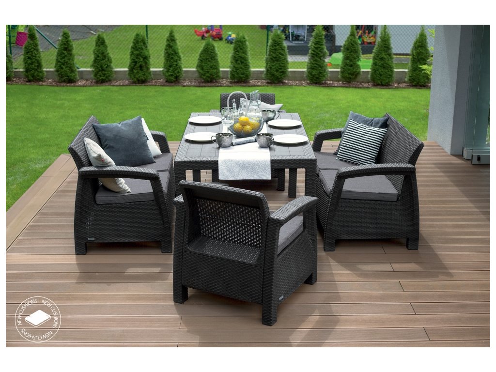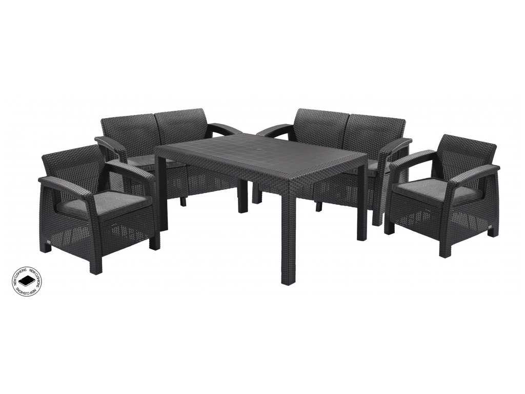 Zahradní set Corfu II Fiesta v tmavě šedé barvě je nábytkový set, který svým vzhledem napodobuje strukturu přírodního ratanu. Set se skládá ze dvou křesel, dvou dvoumístných pohovek (s pohodlnými podsedáky) a velkého obdélníkového stolu. Sada funguje skvěle i jako jídelní nábytek. Corfu II Fiesta je tak ideální set pro uspořádání velkých vnitřních prostor, pro organizaci rodinného grilování nebo i pro zahradní párty s přáteli. Nábytek se vyznačuje dlouhou trvanlivostí a odolností vůči nepříznivým povětrnostním podmínkám a UV záření, takže si po dlouhou dobu udrží svůj původní vzhled i tvar. Díky odolnému plastu, ze kterého je vyroben, nevyžaduje téměř žádnou údržbu a jeho montáž zvládne každý.