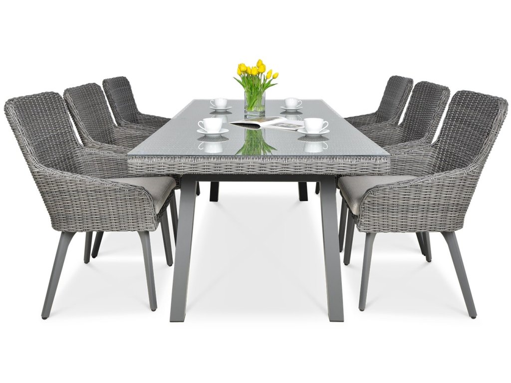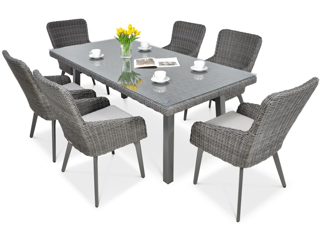 Jídelní set Milano 6/200, skládající se ze 7 prvků, je vhodný jak pro reprezentativní obývací pokoj, tak pro párty na zahradě. Originální estetika nábytku odkazující na populární skandinávský styl jde ruku v ruce s praktickými výhodami. 6 pohodlných židlí a velký obdélníkový stůl ze sady Milano 6/200 mají silnou hliníkovou konstrukci a vzhled ratanového pletiva. A pokud jde o vlastnosti zahradního nábytku, sada Milano Dark Grey 6/200 jednoznačně vyniká svou dlouhou životností, materiál vypadá přirozeně a také poskytuje vysokou odolnost proti poškození UV zářením nebo nepříznivým počasím. A to vše bez jejich namazání jakýmkoli impregnačním prostředkem!