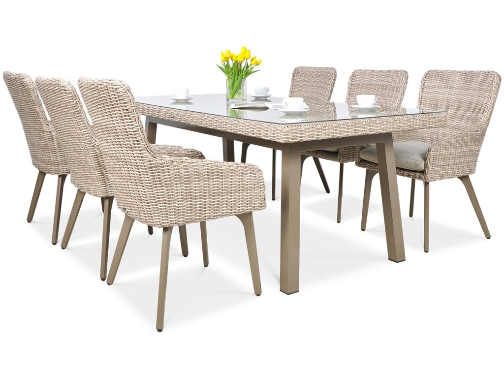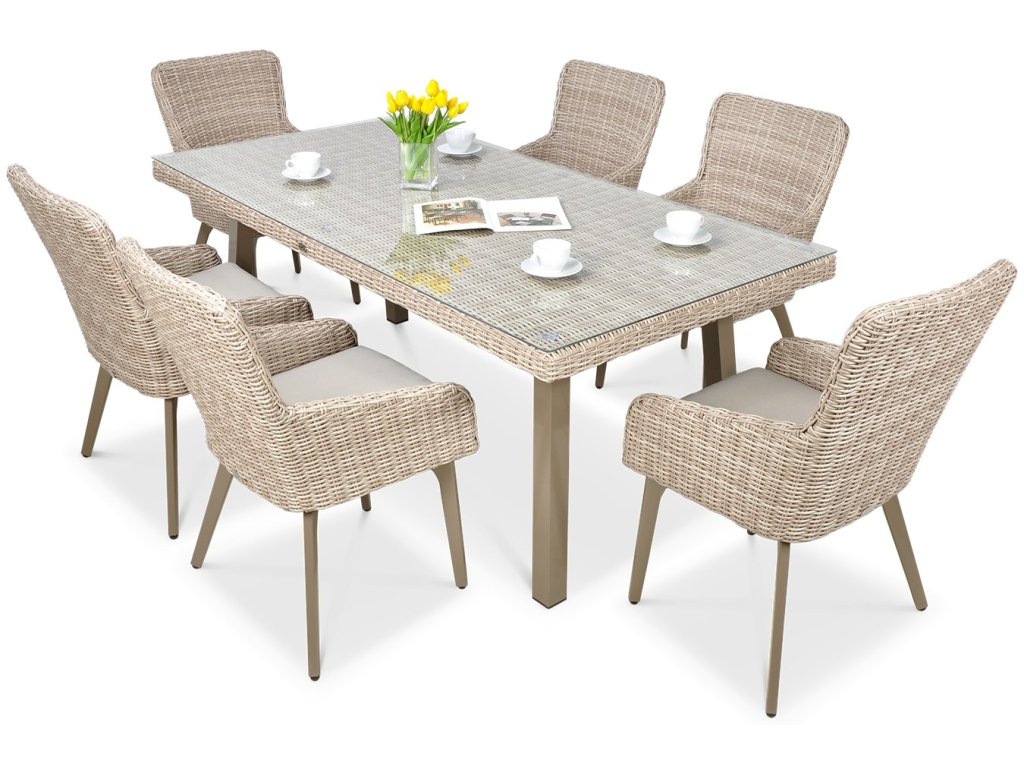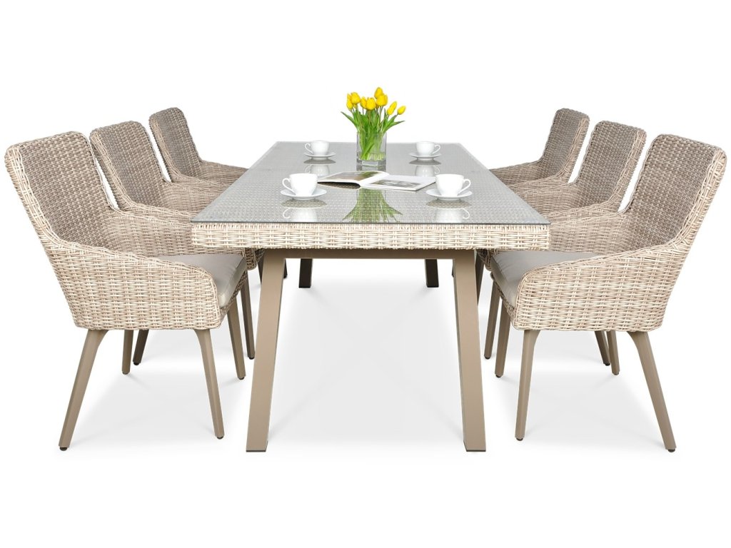 Jídelní set Milano 6/200, skládající se ze 7 prvků, je vhodný jak pro reprezentativní obývací pokoj, tak pro párty na zahradě. Originální estetika nábytku odkazující na populární skandinávský styl jde ruku v ruce s praktickými výhodami. 6 pohodlných židlí a velký obdélníkový stůl ze sady Milano 6/200 mají silnou hliníkovou konstrukci a vzhled ratanového pletiva. A pokud jde o vlastnosti zahradního nábytku, sada Milano Light Beige 6/200 jednoznačně vyniká svou dlouhou životností, materiál vypadá přirozeně a také poskytuje vysokou odolnost proti poškození UV zářením nebo nepříznivým počasím. A to vše bez jejich namazání jakýmkoli impregnačním prostředkem!