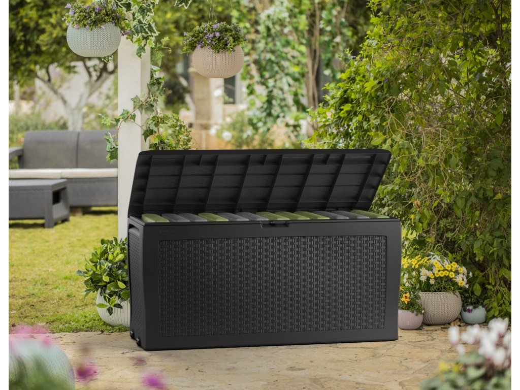 Zahradní úložný box Keter Samoa Rattan poslouží jako perfektní úložný prostor pro polštáře a ostatní doplňky. Struktura jeho povrchu imituje přírodní ratan a je odolná vůči povětrnostním podmínkám a UV záření bez nutnosti údržby. Snadná a rychlá montáž - není třeba žádných nástrojů, a velmi snadno se čistí.
