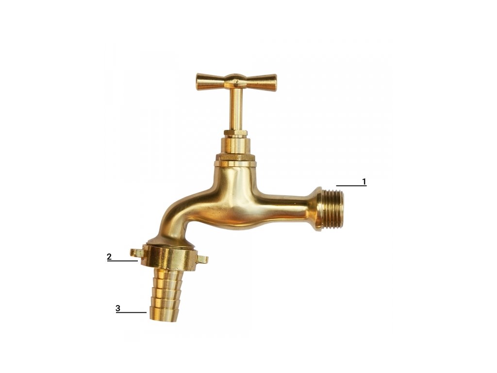 Mosazný kohout pro připojení ke zdroji vody s vyústěním pro napojení zahradní hadice 1/2"