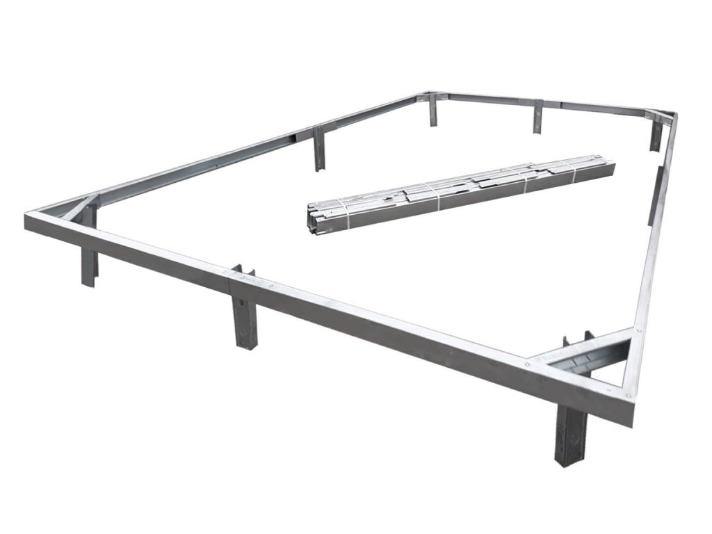 Konstrukce základny skleníku z pozinkované oceli určená pro skleníky dlouhé 6 m a široké 3 m.